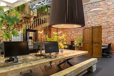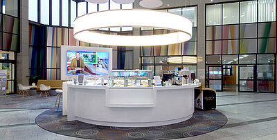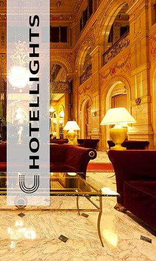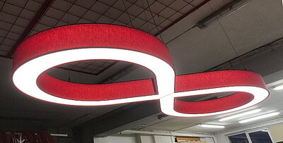 Das Zusammenspiel von professioneller LED-Lichttechnik und einem gewaltigen, doppelwandigen "Saturn-Schirm" sorgen hier für ein Highlight der besonderen Art und akzentuieren den großzügig und modern gestalteten Lobby-Bereich des mehr als repräsentativen Landmark-Buildings.