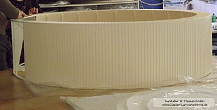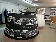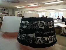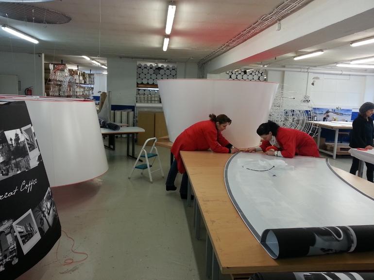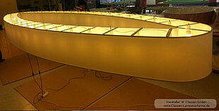 Für einen Messestand durften wir die Form von Blumentöpfen duplizieren – aufwendige Laserbearbeitung einzelner Bauteile des tragenden Gerüstes, schraubbare Verbindungen und größtmögliche Sorgfalt beim abschließenden Bespannen der „Blumentöpfe“ mit mattglänzender Lampenschirmfolie erzeugen diese gelungene Illusion eines echten, umgestülpten Keramikblumentopfes.